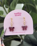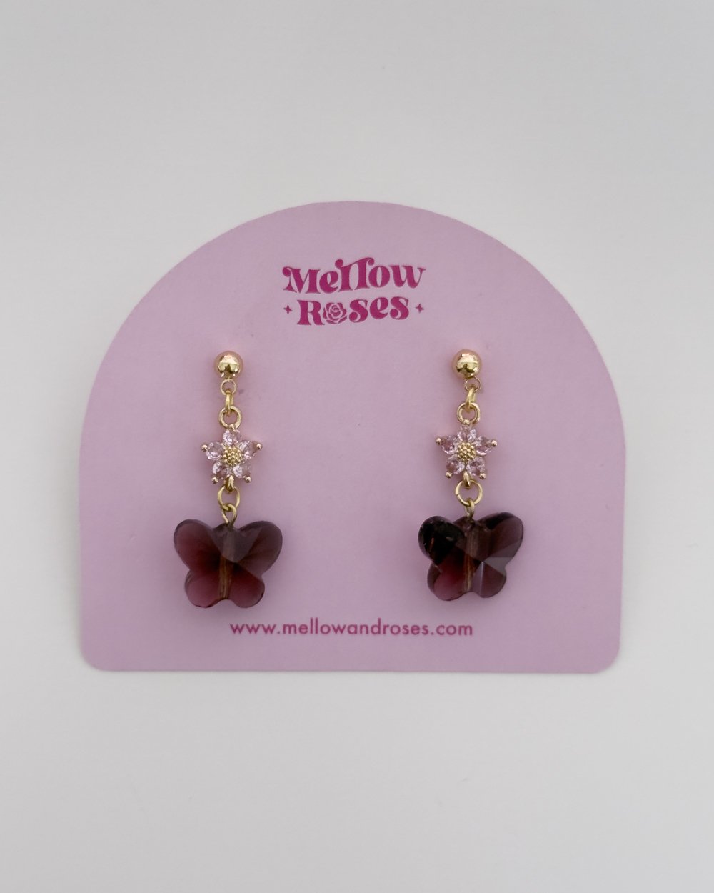 Brown butterfly earrings with a soft pink flower gem, a tiny flutter of warmth for fall days.