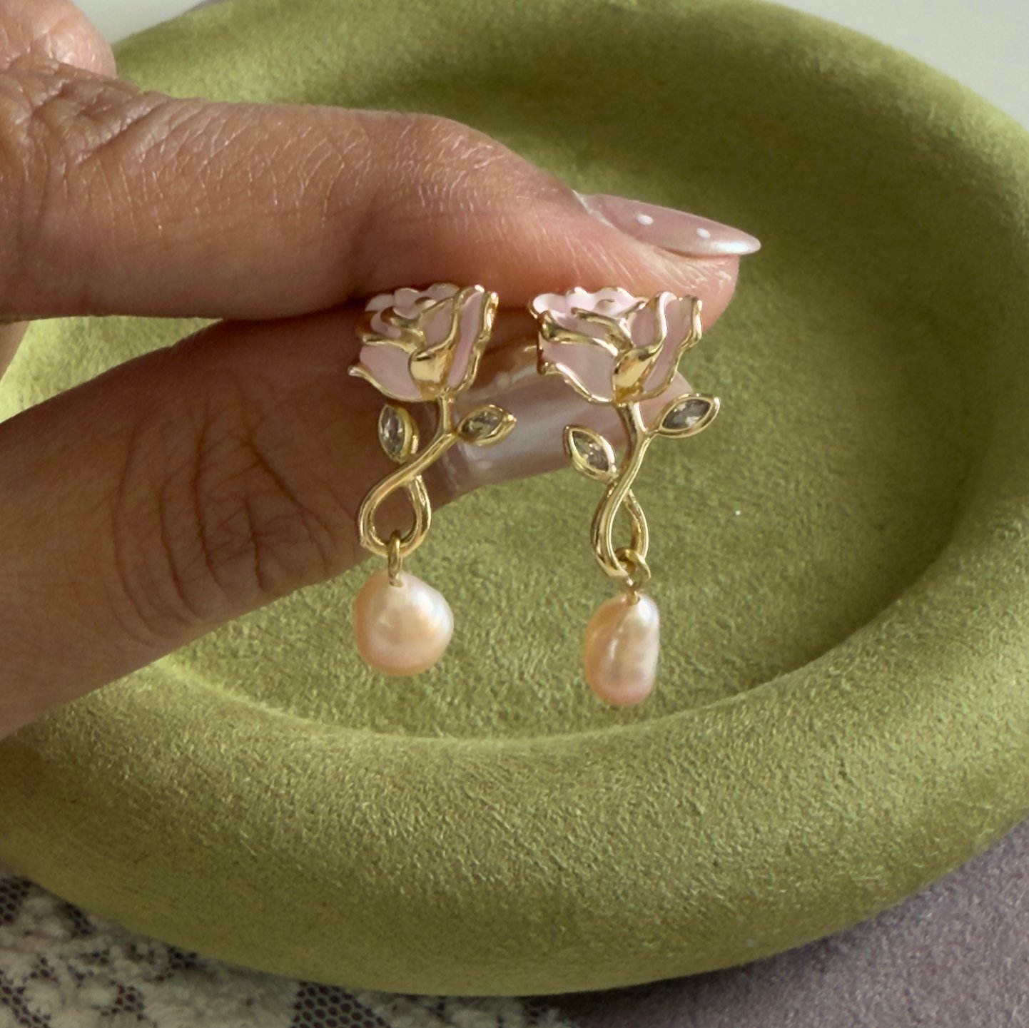 14K gold plated sculpted rose studs finished with a soft glass pearl drop.